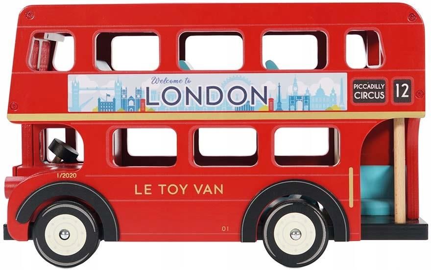 Odkryj wielkie miasto w wielkim stylu dzięki tej klasycznej zabawce w postaci londyńskiego autobusu.Ta ikoniczna drewniana zabawka zdobyła wiele nagród i od dłuższego czasu cieszy się popularnością.Jest w kolorze mocnej czerwieni i posiada wiele realistycznych oznaczeń. Małe figurki i pluszaki mogą wskoczyć na pokład, by przeżyć zabawne przygody podczas zwiedzania.Samochód posiada wiele funkcji, obejmujących miejsca siedzące, dwie kondygnacje, dach i górną kondygnację, które otwierają się i zdejmują, by odsłonić dolną część siedzeń.Z miłością wykonana z trwałego drewna, ta wytrzymała zabawka jest stworzona, by przetrwać lata zabawy, oferując nieskończoną, wolną od plastiku zabawę.To cudowny prezent i zabawka, która rozpali wyobraźnię maluchów, poprawi zręczność i pomoże doskonalić umiejętności motoryczne.Specyfikacja: Przeznaczona dla dzieci od 2 lat Wymiary: szerokość: 36 cm x głębokość: 13 cm x wysokość: 23 cm Wykonana z drewna certyfikowanego przez FSCreg; Inspiruje zabawę społeczną i wyobraźnię Etycznie wykonana z miłości z trwałego drewna Rygorystycznie przetestowana, aby spełnić najwyższe standardy bezpieczeństwa Ozdobiona przy użyciu wodnych, nietoksycznych farb O marceLe Toy Van to brytyjska marka zabawek z drewna, która kocha naturalne materiały i dba o środowisko. Zabawki Le Toy Van są bezpieczne dla dzieci i wykonane z ekologicznych, zrównoważonych surowców. Dzięki unikalnemu designowi i ręcznemu wykończeniu, stają się ulubionymi zabawkami całych rodzin. Marka ta jest symbolem magii zabawy, tworząc wspomnienia na lata. Założona w 1995 roku, rodzinna firma Le Toy Van oferuje kolekcje neutralne płciowo, dostosowane do różnych grup wiekowych. Zabawki marki są dostępne w 65 krajach i cieszą się uznaniem za jakość, design, bezpieczeństwo i zrównoważony rozwój.