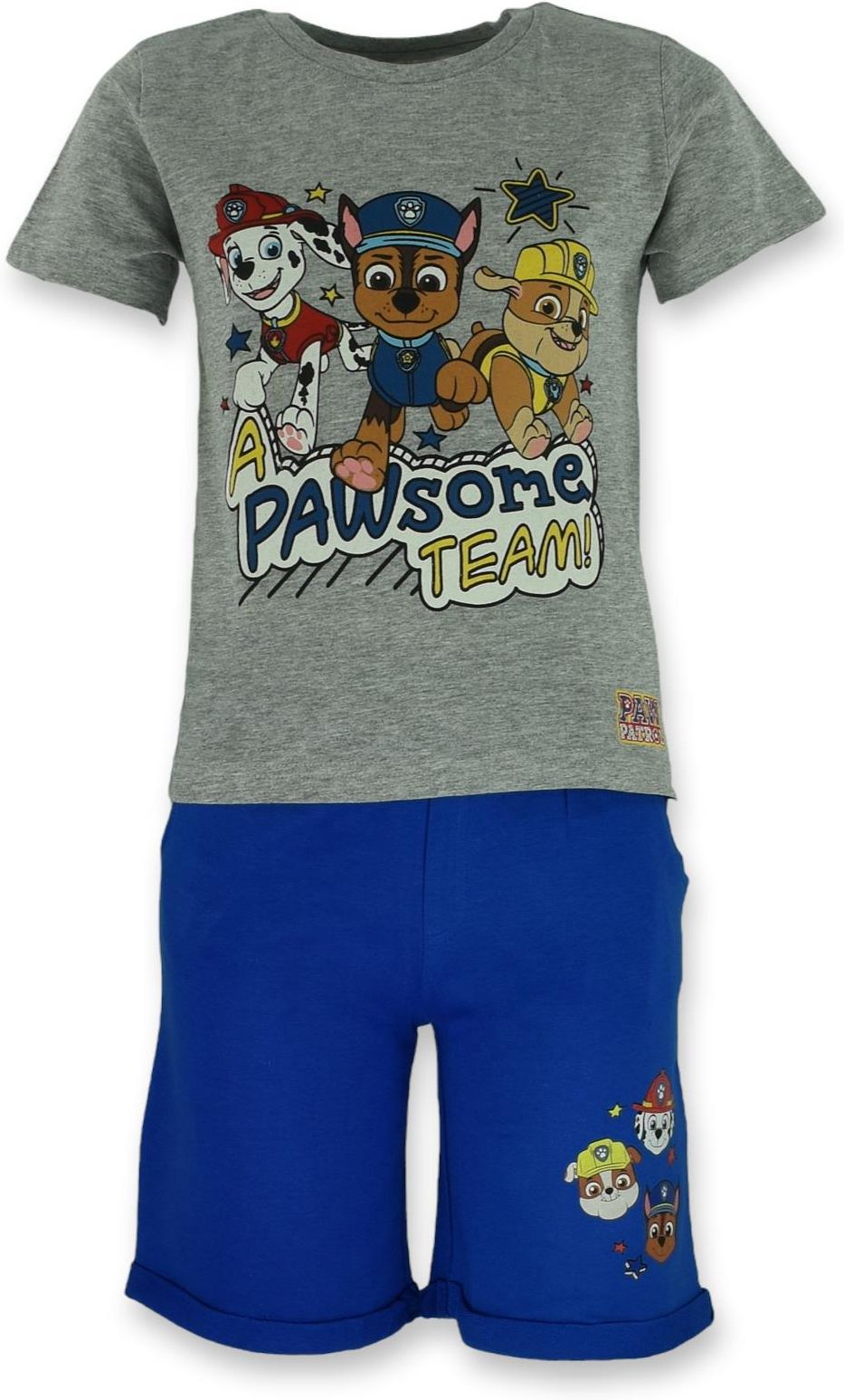 Komplet dla dzieci z bohaterem bajki Psi Patrol. Krótki rękaw bluzki oraz luźne szorty to idealna stylizacja na lato. Skład: Bluzka - 100% Bawełna Spodnie - 100% Bawełna
