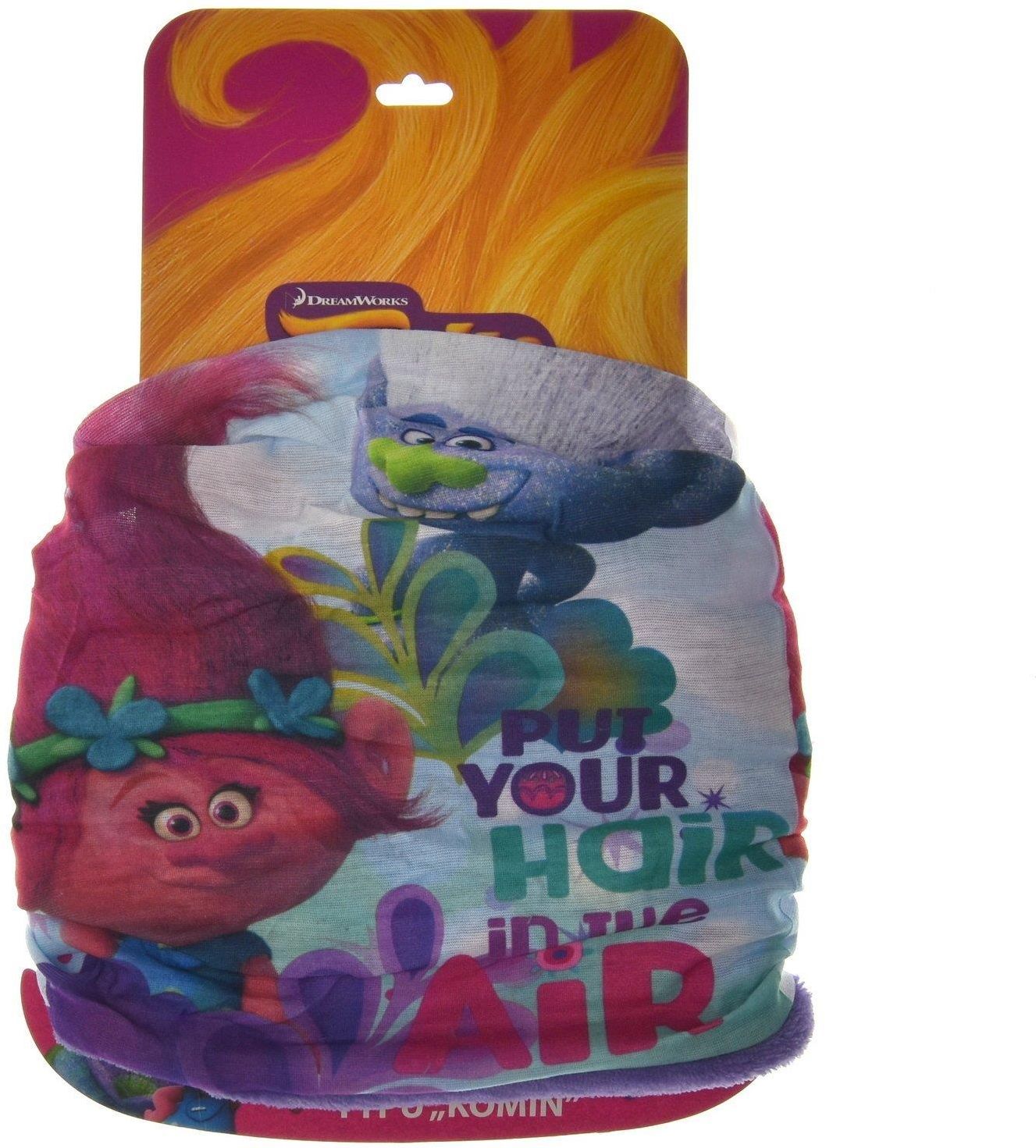 Wielofunkcyjny, dwuwarstwowy komin z motywem lubianej bajki Trolle, w kolorowym wydaniu. Dwie warstwy materiału, połączone z jednej strony, pozwalają dostosować komin do warunków pogodowych. Skład: - 100% poliester Szerokość to około 24 cm