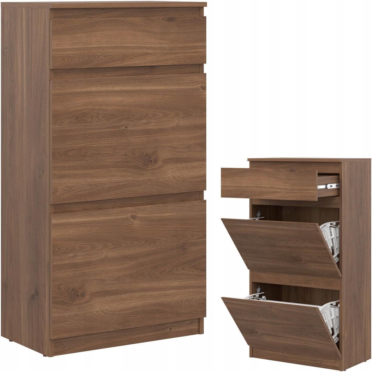 Liveo Meble Szafka Na Buty Klapowa Wąska Castello Remi Rm11 Szafki na buty to niezwykle praktyczne meble, które pomagają w organizacji przestrzeni, szczególnie w przedpokojach. Dzięki nim można łatwo utrzymać porządek i zminimalizować bałagan, co jest istotne w miejscach, gdzie często zmienia się obuwie. Klapowa, wąska szafka od Liveo Meble to doskonała propozycja dla osób, które poszukują estetycznego i funkcjonalnego rozwiązania do swojego wnętrza. Materiał i design Mebel został wykonany z wysokiej jakości płyty laminowanej, co zapewnia mu trwałość oraz odporność na zabrudzenia i zarysowania. Brązowe wykończenie w naturalnej kolorystyce dodaje ciepła i przytulności, sprawiając, że produkt wkomponuje się w różnorodne aranżacje wnętrz. Klasyczne uchwyty zastąpione są podfrezowanymi frontami, co nadaje szafce minimalistyczny i nowoczesny wygląd. Dodatkowo, istnieje możliwość zamontowania oświetlenia LED w półkach szklanych, co podnosi estetykę mebla. Wymiary i pojemność Mebel ma optymalne wymiary: 60 cm szerokości, 113 cm wysokości oraz 30 cm głębokości. Dzięki tym proporcjom szafka zajmuje niewiele miejsca, co czyni ją idealnym wyborem do mniejszych przedpokojów. Pomimo kompaktowych rozmiarów, produkt ma dużą pojemność, umożliwiając przechowanie wielu par butów, co jest istotne w codziennym użytkowaniu. Opcje przechowywania W szafce dostępne są różnorodne opcje przechowywania, które umożliwiają funkcjonalne organizowanie obuwia. Oto kluczowe cechy, które wyróżniają ten mebel: Szuflada: idealna do przechowywania drobnych akcesoriów, takich jak wkładki czy szczotki do butów, Uchylne szafki: dwie uchylne szafki zapewniają łatwy dostęp do par, które najczęściej są używane, Przestronność: dzięki dużej pojemności, możliwe jest przechowywanie różnych rodzajów obuwia, od codziennych butów po obuwie sezonowe, Estetyka: ukrycie obuwia w zamkniętych szafkach wpływa na schludny i uporządkowany wygląd przedpokoju. Montaż Montaż mebla nie powinien sprawić problemów, ponieważ produkt dostarczany jest w paczkach do samodzielnego złożenia. Użytkownicy mają możliwość dostosowania go do swoich potrzeb oraz preferencji, a cały proces montażu można zrealizować w krótkim czasie. Co więcej, szafka może być przymocowana do ściany, co zwiększa jej stabilność oraz pozwala na lepsze zagospodarowanie przestrzeni. Klapowa szafka na buty jest funkcjonalnym i estetycznym rozwiązaniem, które doskonale sprawdzi się w każdym przedpokoju, wprowadzając ład i harmonię do codziennego życia.