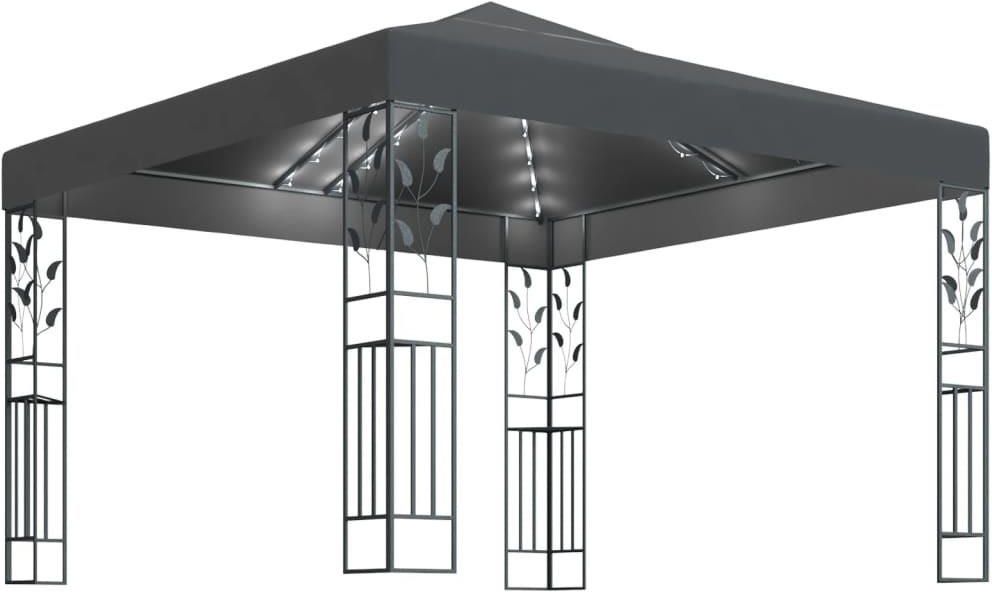Zapewnij sobie cień i prywatność dzięki tej altanie, aby Twoja przestrzeń na świeżym powietrzu stała się jeszcze przyjemniejsza! Tę altanę wykonano z mocnej stali z trwałą i odporną na rdzewienie powłoką proszkową, dzięki czemu posłuży przez lata. Wentylowane zadaszenie powstrzyma słońce i deszcz przed zepsuciem zabawy podczas spotkania rodzinnego, grilla, pikniku popołudniowego lub imprezy urodzinowej. Zadaszenie wykonano z dobrej jakości tkaniny z powłoką PA, która zablokuje większość szkodliwych promieni. Ma ono wzmocnione narożniki i mocowania na rzep, które umożliwiają łatwe przymocowanie zadaszenia do ramy altany. Ponadto sznur lampek stworzy przytulną atmosferę w ogrodzie po zachodzie słońca. Lampki nie powodują zanieczyszczenia środowiska, gdyż są zasilane solarnie w ciągu dnia. UWAGA: tego produktu NIE WOLNO używać podczas złej pogody, takiej jak silny wiatr, intensywne opady deszczu lub śniegu, burza, itp. Kolor altany: antracytowy Kolor światła: ciepły biały Materiał: malowana proszkowo stal, tkanina (100% poliester) z powłoką PA Wymiary: 3 x 3 x 2,5 m (dł. x szer. x wys.) Długość każdego sznura: 6 m Liczba LED: 43 Odległość między diodami LED: 0,25 m Odległość pomiędzy złączem a pierwszą diodą LED: 1 m Źródło zasilania: energia słoneczna Konstrukcja z podwójnym daszkiem zapewnia dobrą cyrkulację powietrza Rama z kwiatowym ornamentem Wymagany montaż: tak