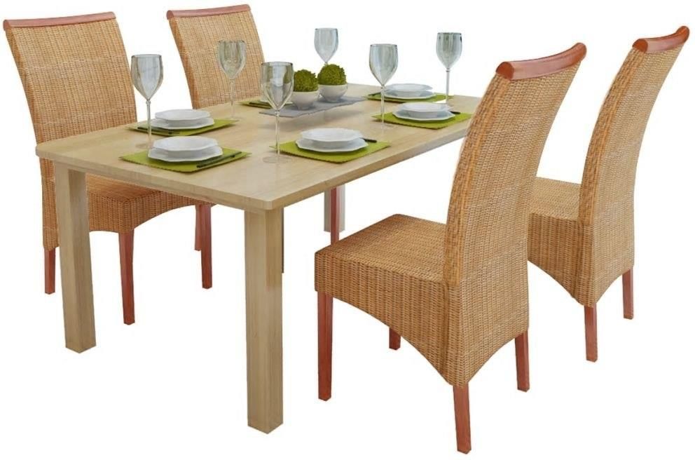 Zestaw mebli rattanowych wykonany na styl tropikalny z ozdobnym, drewnianym elementem będzie świetnym dodatkiem do wystroju. Ramy z drewna i prawdziwy rattan czynią meble solidnymi oraz ładnie wyglądającymi. Pokryte rattanem krzesła będą bardzo wygodne. Jeśli szukasz mebli do uzupełnienie wystroju kuchni lub jadalni ten zestaw będzie idealny. W skład przesyłki wchodzą 4 krzesła. Uwaga: krzesła zostały ręcznie wykonane z prawdziwego rattanu, dlatego mogą występować drobne różnice w kolorze. Materiał: drewno mango + rattan Wymiary krzasła: 47 x 50 x 97 cm (szer. x gł. wys.) Szerokość siedziska: 47 cm Głębokość siedziska: 43 cm Wysokość siedziska nad ziemią: 47 cm Przesyłka obejmuje 4 krzesła