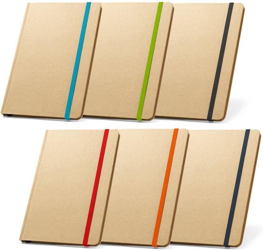 Notes A5 ze 160 stronami w linie z papieru makulaturowego i twardą okładką z kartonu. Zawiera zakładkę z tasiemki oraz gumkę w pasującym kolorze.137 x 210 mm