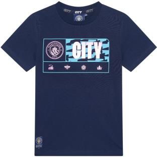 Na obrazku znajduje się ciemnoniebieska koszulka z krótkim rękawem. Na koszulce widnieje duży biały napis "CITY". Obok napisu znajduje się logo drużyny piłkarskiej Manchester City, które ma tradycyjnie okrągły kształt, z niebieskim obramowaniem i złotym herbem w środku. Pod głównym napisem znajdują …