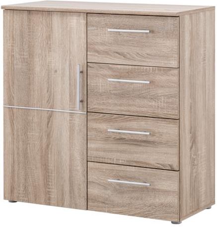 KOMODA PUNTO Komoda z kolekcji Punto to uniwersalne rozwiązanie, które dopasujesz do każdego wnętrza. Mebel występuje w modnym kolorze dąb sonoma. Jasna kolorystyka sprawi, że pokój będzie wydawał się większy, dodatkowo będzie ciekawą bazą do tworzenia aranżacji. Satynowe wstawki i uchwyty wyraźnie akcentują geometryczny kształt mebla. WNĘTRZE Komoda jednodrzwiowa posiada wewnętrzne półki i pojemne szuflady, dzięki temu w prosty sposób rozmieścisz swoje rzeczy. Kulkowe prowadnice zapewniają niemal bezszelestną obsługę szuflad.