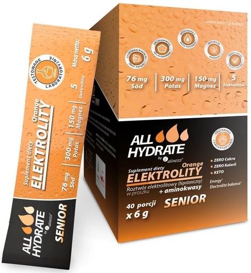 Najważniejsze właściwości: ⬅️ ALLHydrate Elektrolity Sticks SENIOR Pomarańcz 6g x 40 saszetek to suplement diety w formie saszetki o klasycznym smaku pomarańczy, specjalnie opracowany z myślą o osobach starszych i ich specyficznych potrzebach. Produkt charakteryzuje się przyjemnym, cytrusowym aromatem i wygodną formą pojedynczych porcji dostosowanych do wymagań seniorów, które łatwo rozpuszczają się w wodzie. ALLHydrate Elektrolity Sticks SENIOR Pomarańcz 6g x 40 saszetek jest pakowany w 40 indywidualnych saszetki po 6g każda, co zapewnia maksymalną wygodę użytkowania i odpowiednią wielkość porcji dla starszych użytkowników. Praktyczna forma saszetki sprawia, że suplement można łatwo stosować w domu lub zabrać na spacer, a hermetyczne opakowanie chroni proszek przed wilgocią i zachowuje świeży smak pomarańczy. Podsumowując, ALLHydrate Elektrolity Sticks SENIOR Pomarańcz 6g x 40 saszetek wyróżnia się specjalną formułą dla seniorów i klasycznym smakiem pomarańczy. To doskonały wybór dla osób starszych poszukujących praktycznego suplementu elektrolitowego dostosowanego do ich potrzeb w pojedynczych porcjach o odpowiedniej wielkości. Składniki: SKU: 5903242584527