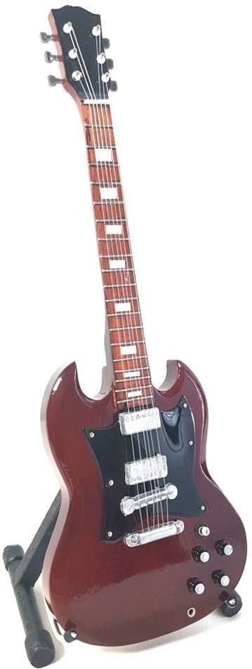 Mini gitara AC/DC - Angus Young, skala 1:4 Wykonana ręcznie, drewno mahoniowe. Wymiary: wys. 27,5cm szer. 9cm gł. 0,8cm skala 1:4 Produkt kolekcjonerski Sprzedający nie jest w jakikolwiek sposób związany z producentami prawdziwych instrumentów czy też z poszczególnymi artystami. Nazwy modeli czy też nazwiska artystów są przykładowe. Znane nazwiska służą wyłącznie do pokazania pewnego stylu uprawiania muzyki. Żaden z instrumentów nie jest wierną repliką co do proporcji, rozmiaru i designu. Wszystkie produkty zostały wykonane ręcznie.