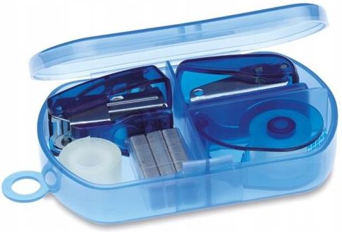 Zestaw biurowy składający się z 5 częsci: - podajnik taśmy klejącej, - mini zszywacz, - mini dziurkacz, - 300 zszywek - rolka taśmy samoprzylepnej. Przezroczyste plastikowe pudełko. Wymiary 9,5 x 6 x 2 cm, waga 0.07 kg BRAK INFORMACJI O KOLORACH ORAZ BŁĘDY W ADRESIE LUB PRZY WPŁACIE, POWODUJĄ WYDŁUŻENIE CZASU WYSYŁKI! MAKSYMALNY CZAS REALIZACJI (WYSYŁKI) ZAMÓWIENIA TO 1 DZIEŃ ROBOCZY, PROSIMY NIE MYLIĆ TEGO Z CZASEM DOSTAWY! NIE PONOSIMY ODPOWIEDZIALNOŚĆI ZA SUGEROWANE TERMINY DOSTAW PODAWANE PRZEZ FIRMY PRZEWOZOWE, W RZECZYWISTOŚCI CZAS DOSTAWY MOŻE BYĆ DŁUŻSZY NIŻ PODAJE KURIER LUB PRZEWOŹNIK! Istnieje możliwość wykonania nadruku na ilościach hurtowych. Na zdjęciu widać przykładowe znakowanie. Nadruki wykonujemy w różnych technologiach i wariantach kolorystycznych.