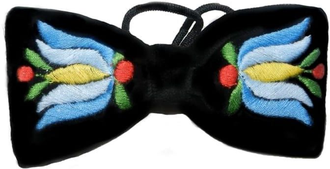 Mucha kaszubska Kaszubska mucha Mucha wykonana z aksamitnego materiału i ręcznie haftowana z motywem tulipana kaszubskiego. Regulowana na okrągłej gumce. Muchy są haftowane ręcznie dlatego wzór może lekko odbiegać od zdjęcia. Wymiary: szerokość: 11 cm wysokość max: 5,5 cm wysokość w zwężeniu: 2 cm Wykonano na Pomorzu