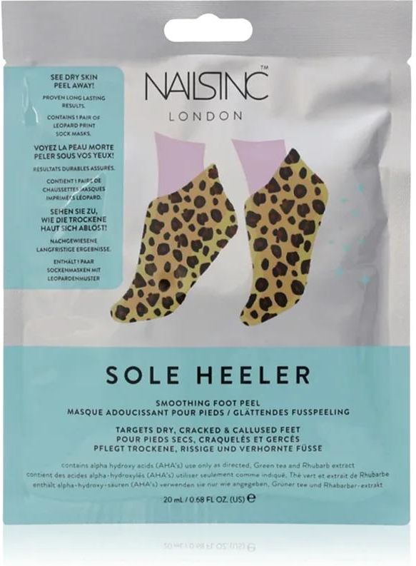 Nails Inc. Sole Heeler, 40 ml, Maseczki do stóp dla kobiet, Nie zapominaj o rutynie pielęgnacyjnej stóp, ponieważ codziennie zmagają się ze zmęczeniem spowodowanym zarówno chodzeniem, jak i staniem. Jednak dzięki regularnej pielęgnacji pozostaną piękne i gotowe do pokonania tysięcy kroków. Maska do peelingu stóp Nails Inc. Sole Heeler działaniu złuszczającemu wspomaga proces złuszczania i stopniowo całkowicie usuwa martwy naskórek. Zmiękcza szorstkie miejsca i sprawia, że stopy pozostają aksamitnie gładkie. Nigdy więcej popękanych pięt, ani stwardniałej i zrogowaciałej skóry, a zamiast tego miękkie i gładkie stopy, których nie będziesz się wstydzić pokazać światu. Właściwości: sprawiam, że stopy stają miękkie i gładkie intensywnie pielęgnuje skórę stóp intensywnie odżywia i nawilża stopy w postaci skarpetek dla łatwej i komfortowej aplikacji Skład: kwas salicylowy – głęboko oczyszcza, odblokowuje zatkane pory i zapobiega powstawaniu zaskórników, pomaga złuszczać obumarły naskórek i usuwa nadmiar sebum kwas glikolowy – złuszcza obumarłe komórki naskórka, a tym samym wspomaga odnowę wierzchniej warstwy skóry, nawilża, przyczynia się do ujednolicenia kolorytu cery, redukcji przebarwień i wygładzenia drobnych zmarszczek zielona herbata – łagodzi, pomaga zwalczać trądzik i nadmierne wydzielanie sebum, zwęża pory i zapobiega ich zatykaniu, chroni przed działaniem wolnych rodników i oznakami starzenia dzięki działaniu antyoksydacyjnemu kwas mlekowy – złuszcza obumarłe komórki naskórka, wspomaga naturalny proces odnowy komórek, a jednocześnie działa nawilżająco, wygładza szorstką strukturę skóry i odblokowuje zatkane pory betaina – nawilża, łagodzi i wygładza skórę, podtrzymuje jej optymalne nawodnienie Sposób użycia: Nanieś na czystą i suchą skórę stóp. Wyjmij skarpetki z opakowania i nałóż na stopy. Pozostaw przez zalecany czas. Pozostaw na skórze określoną liczbę minut: 60. Potem dokładnie spłucz wodą. Nie zdzieraj twardej i zrogowaciałej skóry pumeksem ani skrobaczką, ponieważ po kilku dniach zacznie się ona łuszczyć.