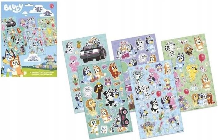 Bluey - Zestaw 94 naklejek Zestaw 94 naklejek z motywem z popularnej bajki Bluey zapewni wszystkim dzieciom wiele chwil kreatywnej zabawy, szczególnie że dzięki naklejkom można ozdobić dosłownie wszystko: zeszyt, wpis do pamiętnika, notatki czy ramkę na zdjęcia. Opakowanie skrywa aż 5 arkuszy …