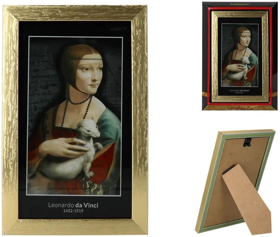 Obrazek - L. da Vinci, Dama z łasiczką (CARMANI) Obrazek - L. da Vinci, Dama z łasiczką (CARMANI) Mały obrazek do powieszenia na ścianie, który nada pomieszczeniu wyjątkowego charakteru. Idealny dla miłośników malarstwa. Wykonany ze szkła, w ramce. Wymiary: 13x21cm z ramką, bez ramki: 10,5x18,5cm. Zapakowany w ozdobne pudełko oraz zabezpieczony folią.Informacje o produkcie Rozmiar 13x21cm 5907580090504 262-9217