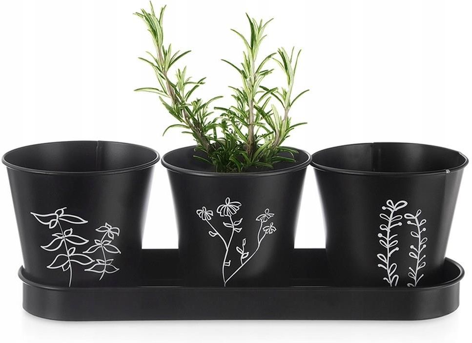 Zestaw trzech doniczek na zioła - Zestaw składa się z trzech doniczek oraz podstawki. Idealne do uprawy świeżych ziół w kuchni lub na parapecie. Każda osłonka ma wymiary: średnica górna 11 cm, średnica dolna 7,5 cm, wysokość 10,5 cm. Zestaw doniczek umieszczonych na podstawce ma wymiar 31,5 x 11 x 10,5 cm. Doniczki z serii Blackline. Wykonane z metalu z roślinnym dekorem - Doniczki wykonane są z najwyższej jakości metalu w czarnym kolorze z motywem roślinnym na każdej doniczce, co nadaje im unikalny wygląd, pasujący do różnorodnych aranżacji wnętrz. Możliwość bezpośredniego sadzenia - Doniczki posiadają praktyczny otwór drenażowy, który umożliwia bezpośrednie zasadzenie roślin. Dzięki temu nadmiar wody swobodnie odpływa, co sprzyja zdrowemu wzrostowi ziół lub innych roślin. Uniwersalne zastosowanie - Doniczki sprawdzą się do zasadzenia różnego rodzaju ziół, ale także pozwolą na uprawianie w nich mniejszych roślin doniczkowych. Element dekoracyjny - Stylowy i funkcjonalny zestaw idealnie sprawdzi się w każdej kuchni, jadalni czy salonie. Doskonale pasuje zarówno do nowoczesnych, jak i klasycznych wnętrz, łącząc elegancki design z praktycznym użytkowaniem. Dekoracyjny zestaw trzech doniczek na zioła, umieszczonych na praktycznej podstawce. Idealny do uprawy świeżych ziół lub mniejszych roślin doniczkowych. Stylowy design w połączeniu z funkcjonalnością sprawia, że zestaw doskonale wpasuje się w każde wnętrze, dodając mu naturalnego uroku. Oryginalny produkt czeskiej marki Orion. Wyprodukowano zgodnie z europejskimi standardami.