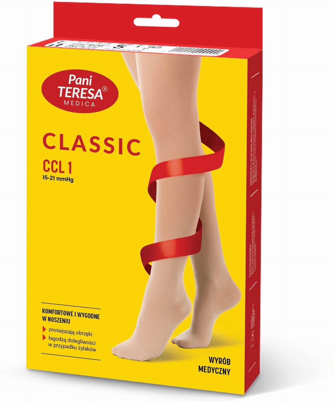 Pończochy uciskowe CLASSIC CCL1 od Pani Teresa Medica to doskonałe rozwiązanie dla osób zmagających się z problemami krążeniowymi, takimi jak żylaki, obrzęki czy uczucie ciężkich nóg. Dzięki pierwszej klasie kompresji (CCL1: 18-21 mmHg), zapewniają skuteczne wsparcie w profilaktyce i leczeniu przewlekłej niewydolności żylnej. Wykonane z wysokiej jakości materiałów, zapewniają komfort noszenia przez cały dzień, a anatomiczny kształt i szeroka gama rozmiarów gwarantują idealne dopasowanie. Elegancki wygląd sprawia, że świetnie komponują się z codziennym i biznesowym strojem. Cechy: kompresja klasy I (15-21 mmHg) – idealna do profilaktyki i leczenia problemów z krążeniem. wysokiej jakości, oddychające materiały zapewniają komfort noszenia przez cały dzień. zalecane dla osób z tendencją do opuchnięć nóg, żylaków oraz osób prowadzących siedzący tryb życia. produkt medyczny spełniający najwyższe standardy jakości. Wskazania: narastający obrzęk w ciągu dnia, profilaktycznie do pracy stojącej i długotrwałego siedzenia wieczorne uczucie zmęczenia i ciężkości nóg żylaki kończyn u rodziców, rodzeństwa dziedziczne zaburzenia w zakresie układu krzepnięcia pojawiające się tzw. pajączki żylne po rozpoczęciu terapii hormonalnej (np. hormonalna terapia zastępcza) wyraźne żyły na kończynie, ale bez wyraźnego uwypuklenia Przeciwwskazania: miażdżyca kończyn dolnych choroba Beürgera; tzw. stopa cukrzycowa. Dostępne kolory: Skład: Poliamid 78%, Elastan 22%
