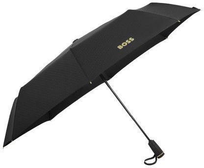 Kieszonkowy parasol Double B w kolorze czarnym ze złotymi metalowymi akcentami prezentuje logo BOSS Double B w trójwymiarowym wykonaniu, wzmocnione luksusowym metalicznym poszyciem na końcówkach rączki. Wyposażony w miękką, gumową teksturę uchwytu i subtelną, ton w ton czaszę z monogramem, ten parasol jest zarówno praktyczny, jak i elegancki. Stelaż jest lekki i kompaktowy, a podwójny automatyczny system otwierania i zamykania zapewnia płynną obsługę. Wysokiej jakości, wodoodporna czasza jest uzupełniona wyrafinowanym pokrowcem zapinanym na zamek błyskawiczny z grawerowanymi wykończeniami BOSS dla wygodnego przenoszenia.