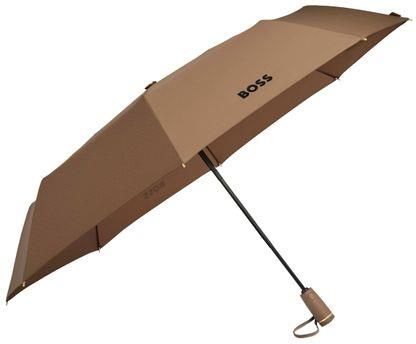 Kieszonkowy parasol Double B w kolorze wielbłądzim ze złotymi metalowymi akcentami ma trójwymiarowe logo BOSS Double B, wzmocnione metalicznym poszyciem na końcówkach rączki. Parasol posiada miękką, gumową teksturę uchwytu i czaszę z monogramem ton w ton, co zapewnia wyrafinowany design. Dzięki lekkiej, ergonomicznej ramie i podwójnemu automatycznemu systemowi otwierania i zamykania, parasol ten oferuje zarówno wygodę, jak i styl. Wysokiej jakości, wodoodporna czasza i luksusowy pokrowiec zapinany na zamek błyskawiczny z grawerowanymi wykończeniami BOSS sprawiają, że jest on zarówno funkcjonalny, jak i przenośny.