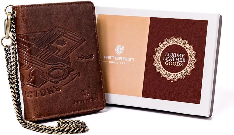 Skórzany portfel męski na zamek — Peterson Najwyższa jakość wykonania | Uszyty z wysokogatunkowej skóry naturalnej. Specjalna technika garbowania, niezmienna od dziesięcioleci, pozwala na pokazanie naturalności i piękna tego naturalnego surowca Prezent dla fana motocykli | Na powierzchni portfela …