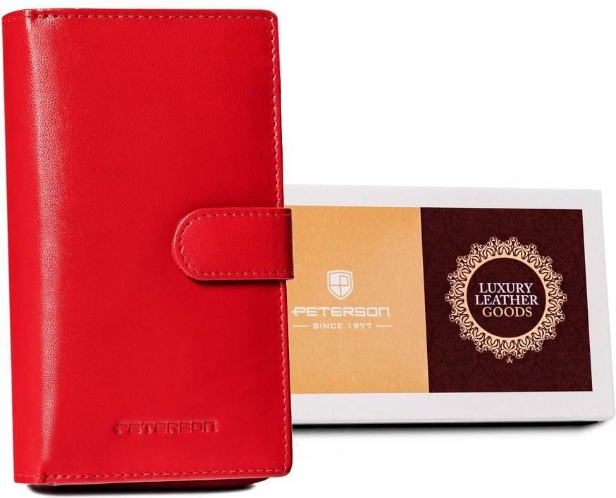 Pionowy portfel damski ze skóry naturalnej — Peterson Produkt najwyższej jakości | Odszyty bardzo trwale z doskonałej jakości skóry naturalnej o gładkiej fakturze Klasyczny czarny design | Portfel o klasycznej stylistyce w klasycznym czarnym kolorze. Model w orientacji pionowej, zapinany bezpiecznym i trwałym zatrzaskiem; Mnóstwo miejsca na karty | Portfel będzie dla Ciebie idealny, jeżeli na co dzień nosisz dokumenty w dużym formacie jak np. dowód rejestracyjny. Ponadto zmieścisz w nim pokaźne ilości kart oraz gotówki; Bezpieczeństwo na najwyższym poziomie| Wyposażony w technologię RFID BLOCKING SYSTEM, która zabezpiecza karty zbliżeniowe, dokumenty biometryczne, legitymacje i karty komunikacji; miejskiej przed nieautoryzowanym odczytem danych. Najwyższa jakość wykonania! Portfel wykonany z przyjemnej w dotyku, wysokiej jakości naturalnej skóry o gładkiej fakturze. Tradycyjna technika garbowania oraz wykorzystanie starannie wyselekcjonowanych materiałów jest gwarancją długiego użytkowania! Mnóstwo miejsca na Twoje karty i dokumenty Jesteś Kobietą, która ma mnóstwo kart lojalnościowych, kredytową, płatniczą i inne karty w takim formacie? A może jesteś również kierowcą i wolisz mieć dowód rejestracyjny Twojego pojazdu zawsze przy sobie? Doskonale! Wyszliśmy naprzeciw takim oczekiwaniom. W portfelu mieści się: aż 16 przegródek dedykowanych na karty, wizytówki lub dokumenty w standardowym formacie; 3 kieszonki na dokumenty w większym formacie, jak dowód rejestracyjny w okładce. Jedna z nich jest przezroczysta, idealne na dokumenty, do których musisz mieć sprawny wgląd; Przegródki na karty i dokumenty też zabezpieczono podszewką. Pozwala to uniknąć otarć na skórze, podczas wkładania i wyjmowania kart niezliczoną ilość razy. Sekcja na pieniądze Portfel jest bardzo pojemny. Kieszenie na banknoty i monety są odpowiednio duże, aby pomieścić pokaźne ilości pieniędzy. bilon schowasz do zewnętrznej 1 kieszeni, która jest w zasadzie osobną sekcją. To wygodne rozwiązanie, jeśli w danej sytuacji potrzebujesz tylko drobnych. Kieszeń jest potrójna, komory przedziela kieszeń na suwaczek. banknoty zmieścisz w 2 pojemne, otwarte przegródki