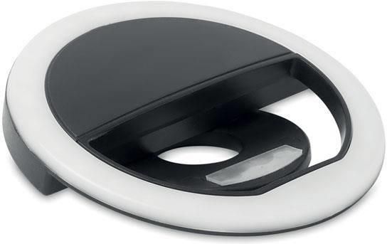 Przenośna lampa do selfie 8 cm przenośny pierścień do selfie z tworzywa ABS z 28 diodami LED. Białe światło regulowane na 3 różnych poziomach jasności. Ładowalna bateria USB 80 mAh. Przenośna lampa pierścieniowa do selfie. MO6242-03