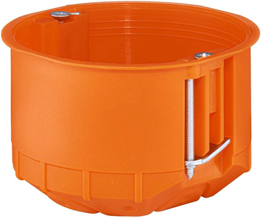 Puszka do pustych ścian P60KF. Dane techniczne: średnica zewnętrzna: 68 mm głębokość: 47 mm rozstaw mocowania osprzętu: 60 mm odstęp osi wiercenia otworów pod puszkę: 71 mm materiał: polipropylen (PP), samogasnące, bezhalogenowe kolor: pomarańczowy odporność na żar: 960 °C montaż: podtynkowy opakowanie: 100 sztuk