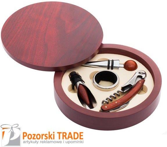 Zestaw do wina w drewnianym pudełku. Składa się z otwieracza, okapnika, nalewaka i zatyczki., Wymiary: 160.0mm x160.0mm x32.0mm, kolor: bordowy, material: MDF