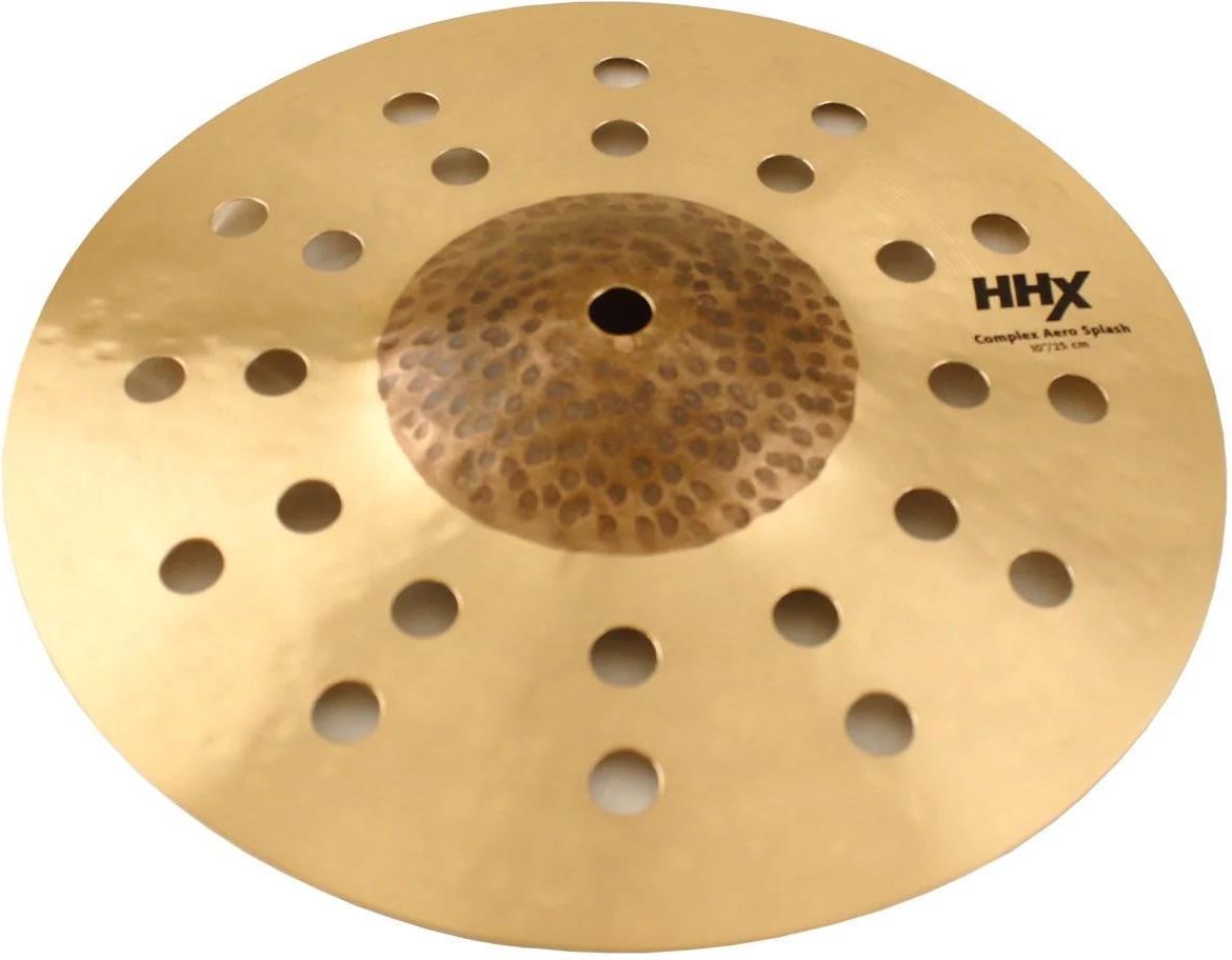 SABIAN 110 XAC AERO CRASH 10”. Wykorzystuje technologię takich modeli jak Evolution, Legacy, a nawet Artisan. SABIAN HHX Complex to linia, w której zastosowano kombinację młotkowania HH i HHX. - Waga: extra thin - Głośność: soft, general - Barwa: ciemna - Materiał: B20