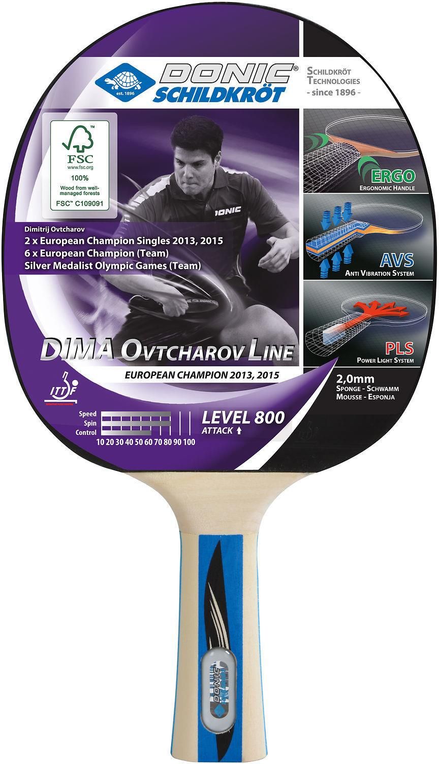Rakietka tenisowa Donic Schildkröt Ovtcharov 800 sygnowana nazwiskiem wielokrotnego medalisty Olimpijskiego - Dimitrija Ovtcharova. Modeli z linii rakietek przeznaczonych dla zaawansowanych graczy do gry wszystkimi technikami z rotacją i dużą szybkością. Rakietka posiada gąbkę o grubości 2 mm oraz rączkę z drewna 5T (Tactic) o wklęsłym kształcie (Concave) pochodzącego z drewna certyfikowanego FSC®. Wyposażona w Anti-Vibration-System, który dzięki dwóm specjalnym warstwom miękkiego laminatu pomiędzy trzonem a uchwytem absorbuje wibracje powstałe przy uderzeniu rakietką piłki oraz poprawia kontrole nad piłką. Dzięki temu pozwala zwiększyć celność uderzeń zarówno w czasie ataku jak i w czasie obrony. Dodatkowo posiada uchwyt ERGO, która jest anatomicznie dopasowana do dłoni, a uchwyt i blat tworzą jedną powierzchnię. Zaokrąglone brzegi zapobiegają uciskom na dłoń i zwiększają komfort gry. Wydrążona rękojeść Power Light System zmniejsza całkowitą masę rakietki i przenosi środek ciężkości ku główce rakietki zapewniając większą siłę i szybkość przy zachowaniu doskonałego czucia. Parametry rakietki: Szybkość: 80/100 Rotacja: 80/100 Kontrola piłki: 60/100