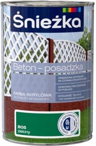 SNIEŻKA farba akrylowa BETON POSADZKA zielony 1LOpis:Stanowi zawiesinę pigmentów i wypełniaczy w wodnej dyspersji żywicy akrylowej o podwyższonej odporności na ścieranie. Ze względu na swoje właściwości farba ta przeznaczona jest do dekoracyjno-ochronnego malowania podłoży betonowych wewnątrz i na zewnątrz pomieszczeń. Szczególnie polecana jest do ogrodzeń i konstrukcji betonowych, fasad domów, tarasów, chodników ogrodowych, garaży przydomowych i balkonów oraz posadzek nienarażonych na intensywny ruch pojazdów.Główne cechy:- Zwiększona odporność na ścieranie- Wysoce odporna na warunki atmosferyczne- Doskonale przyczepna do podłożyDane techniczne:Wydajność: do 8 m2/l przy jednokrotnym malowaniuPojemność: 1lIlość warstw: 2-3Sposób nanoszenia: pędzel, wałkiem lub natryskKolor: zielony