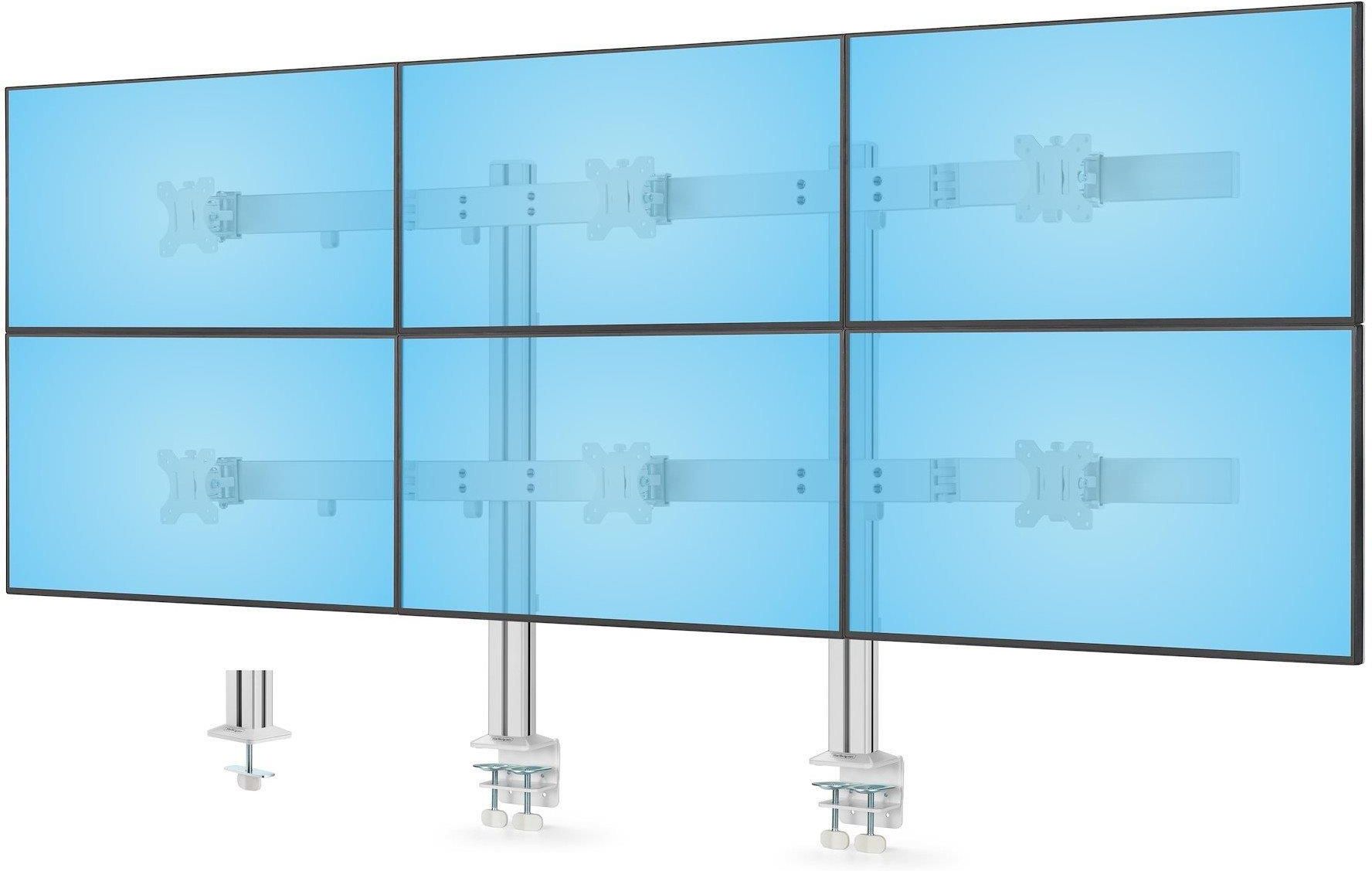 MONITOR SIX-MONITOR: Konstrukcja poprzeczna zapewnia stabilne poziome ustawienie monitorów przez cały czas, zapewniając płynne wrażenia wizualne; Sześć regulowanych uchwytów VESA 75 x 75/100 x 100 do 81 cm i 17,6 funta (8 kg) na ekran; konstrukcja aluminiowa i stalowa STABILNOŚĆ PODWÓJNEJ KOLUMNY: Wytrzymały uchwyt na monitor z podwójną kolumną z ulepszoną konstrukcją podstawy, która nie przechyla się z czasem, zapewnia bezpieczne i sztywne rozwiązanie montażowe na wielu monitorach; Zapewnia bardziej równomierne rozłożenie ciężaru na biurku, poprawiając ogólną stabilność IDEALNA KONSTRUKCJA 3X2: Indywidualna regulacja mikrowysokości dla precyzyjnego ustawienia każdego monitora; Zewnętrzne monitory mogą być ustawione pod kątem (+/-16°) w kierunku użytkownika; Każdy rząd ekranów można regulować na wysokości wzdłuż 34-calowych (86,3 cm) kolumn (w zestawie narzędzia) REGULACJA WYŚWIETLACZA: Płyty VESA obsługują obrót +/-17°, nachylenie +/-34° i obrót ekranu o 360° w pionie/poziomie; Ergonomiczny uchwyt umożliwia przesuwanie monitorów wzdłuż poprzeczek o szerokości 1,8 m WSZECHSTRONNA INSTALACJA: Konstrukcja zacisku C do biurek o grubości 1-7,5 cm lub uchwytów z otworem przelotkowym do biurek o grubości 1–4,5 cm; zdejmowane płyty VESA do wygodnej instalacji/demontażu monitora; klipsy do zarządzania kablami do poprzeczek i kolumn