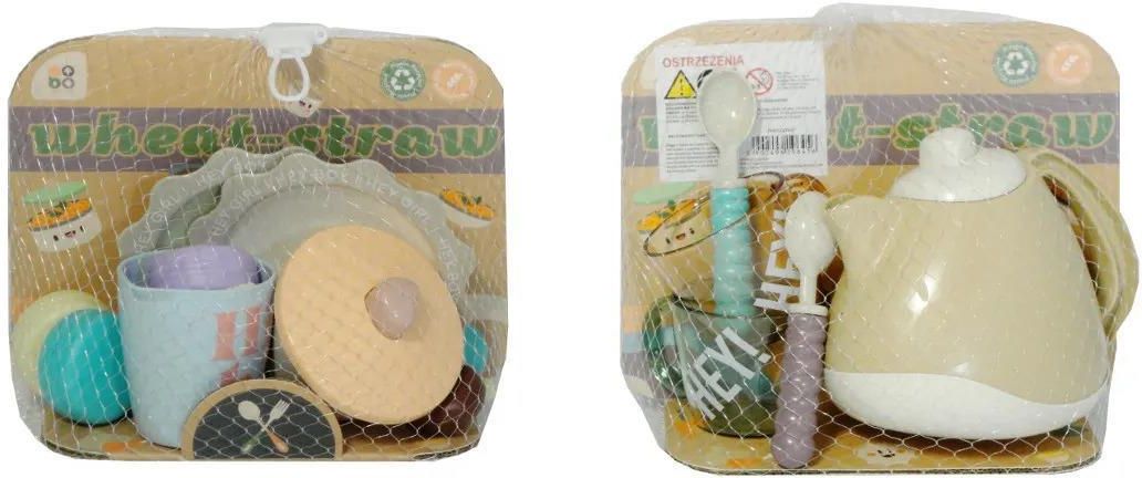 Zestaw naczyń kuchennych z kubkami, talerzykami i czajniczkiem. Idealny do zabawy w dom. Zapakowany w worek z siateczki. Produkt występuje w kilku wersjach kolorystycznych, wybierany losowo. Cena dotyczy jednej sztuki. Zabawka przeznaczona dla dzieci od lat 3. Podane wymiary są wymiarami produktu w opakowaniu.