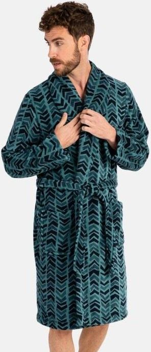 Długi szlafrok męski z polarowej tkaniny z geometrycznym nadrukiem w jodełkę na zewnątrz i jednokolorowym ciemnozielonym kolorem od wewnątrz. Dwurzędowy, z kołnierzem smokingowym, paskiem i dwiema kieszeniami. Bardzo efektownie się prezentuje i jest przyjemny w dotyku. Zwykle męskie szlafroki są …