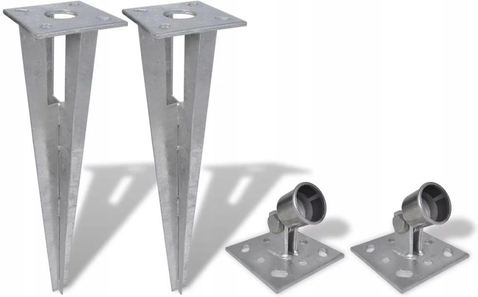 Zestaw ten składa się z 2 szpikulców i 2 uchwytów na słupek i jest przeznaczony do podparcia słupków wspornikowych, tak aby lepiej zamocować ogrodzenie. Wykonane ze stali ocynkowanej kotwy i uchwyty na słupek są odporne na rdzę, co zapewnia ich długotrwałe użytkowanie. Materiał: stal ocynkowana Wysokość kotwy: 0,5 m Wewnętrzna średnica łącznika słupka: 3,5 cm Śruby nie wchodzą w skład zestawu Opakowanie: 2 x kotwy ze szpikulcami 2 x uchwyt na słupek
