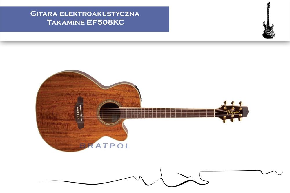 Gitara elektroakustyczna Takamine EF508KC Gitara elektroakustyczna Takamine EF508KC, to model z serii Legacy. Jest to bardzo precyzyjnie wykonana gitara. Posiada zamontowany przetwornik CT4B, który jest popularny wsród profesjonalnych gitarzystów. Kolejny model firmy Takamine, która produkcję gitar rozpoczęła już w 1962 roku. Na początku firma posiadała tylko mały sklepik u podnóża góry Takamine, od której wzięła się nazwa tej marki. Ważnym rozdziałem w historii Takamine, jest wstąpienie do firmy w 1968 roku cenionego i utalentowanego lutnika Mr. Mass Hirade. Już po kilku latach współpracy, gitary Takamine znane były na całym świecie. Po ponad 50-letnim doświadczeniu w produkcji gitar, Takamine może poszczycić się swoją wspaniałą opinią, na temat ich gitar bardzo wysokiej jakości. Specyfikacja: wierzch: ozdobne Koa tył/boki: ozdobne Koa gryf: mahoń podstrunnica: palisander menzura: 25,3" elektronika: CTP-2 Cool Tube™ Preamp System with 3-Band EQ, Auxiliary Input, Onboard Chromatic Tuner, and Palathetic™ Under-Saddle Pickup potencjometry: Volume Control, 3-Band EQ osprzęt: pozłacany kolor: naturalny połysk