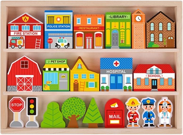 TOOKY TOY Drewniany Zestaw Budynków i Figurek Miasto Zestaw Budynków iFigurek od marki TOOKY TOY pozwoli zbudować swoje małe miasteczko i zacząć odrywać figurkami różne scenki, które mogłyby się w nim wydarzyć. Komplet pozwala na samodzielną zabawę, ale jest również doskonałym uzupełnieniem innych zestawów. Zestaw zawiera drewniane pudełko z przegródkami, 11 figurek budynków, 3 figurki postaci, w tym: strażaka, policjanta i lekarza oraz 6 figurek innych obiektów: znak stopu, światła drogowe, dwa drzewka, krzew i skrzynkę na listy. Poprzez odgrywanie ról dziecko rozwija swoją kreatywność, wyobraźnię oraz umiejętności społeczne. Całość wykonana z najwyższej jakości materiałów i pomalowana nietoksycznymi farbami bezpiecznymi dla dzieci i środowiska. Charakterystyka: - figurki z zestawu przedstawiają małe miasteczko, - zestaw pozwala na samodzielną zabawę, - idealny komplet do odgrywania różnych ról, - całość wykonana z trwałego drewna, - figurki pomalowane nietoksycznymi farbami. Zestaw zawiera: - 11 figurek budynków, w tym: komisariat, remizę strażacką, szpital, szkołę, bibliotekę, restaurację sklep zoologiczny, stodołę, wieżę zegarową oraz dwa domki, - 3 figurki postaci: strażaka, policjanta oraz lekarza, - 6 figurek obiektów: znak stopu, światła drogowe, dwa drzewka, krzew i skrzynkę na listy, - drewniane pudełko z przegródkami. Tooky Toy to firma produkująca drewniane zabawki dla dzieci, obecna na rynku od 2004 roku. Kilkanaście lat doświadczenia w branży to gwarancja wysokiej jakości produktów, wytwarzanych z myślą o bezpieczeństwie dzieci. Zabawki Tooky Toy posiadają liczne certyfikaty potwierdzające bezpieczeństwo tych ekologicznych produktów. Dobrze wygładzone, wolne od drzazg i ostrych krawędzi zabawki, pokryte są wyłącznie bezpiecznymi, nietoksycznymi farbami, barwnikami i lakierami. To wszystko sprawia, że zabawki Tooky Toy są uwielbiane przez dzieci i doceniane przez rodziców na całym świecie. Wiek: od 3 lat Płeć: chłopiec/dziewczynka Materiał wykonania: Drewno kolory: wielokolorowy Wymiary produktu: 30 x 22 x 2,7 (cm) Wiek: od 3 lat Płeć: chłopiec/dziewczynka Materiał wykonania: Drewno kolory: wielokolorowy Wymiary produktu: 30 x 22 x 2,7 (cm)