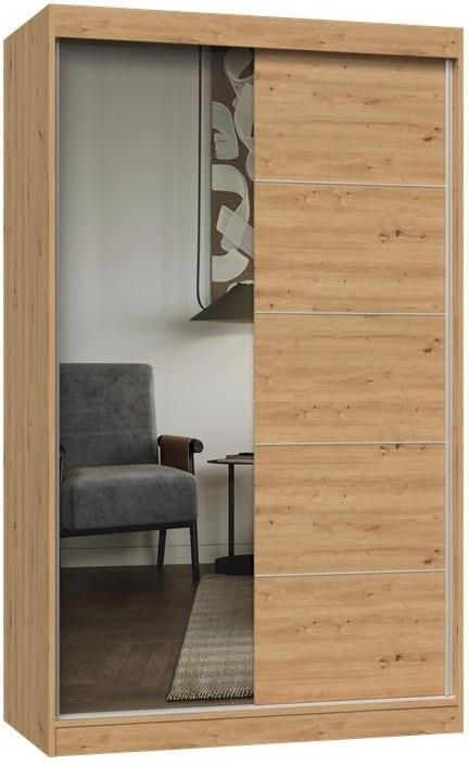 SZAFA Z DRZWIAMI PRZESUWNYMI "IGA" MODEL: 120 CM, Wersja z 1 Lustrem i Szprosami Kolor korpus: DĄB ARTISAN Front drzwi: DĄB ARTISAN IDEALNA DO BIURA LUB SYPIALNI szafa z 1 lustrem i dekoracyjnymi listwami (szprosami) na froncie drzwi nowoczesny mix modnych kolorów praktyczne półki miejsce z …