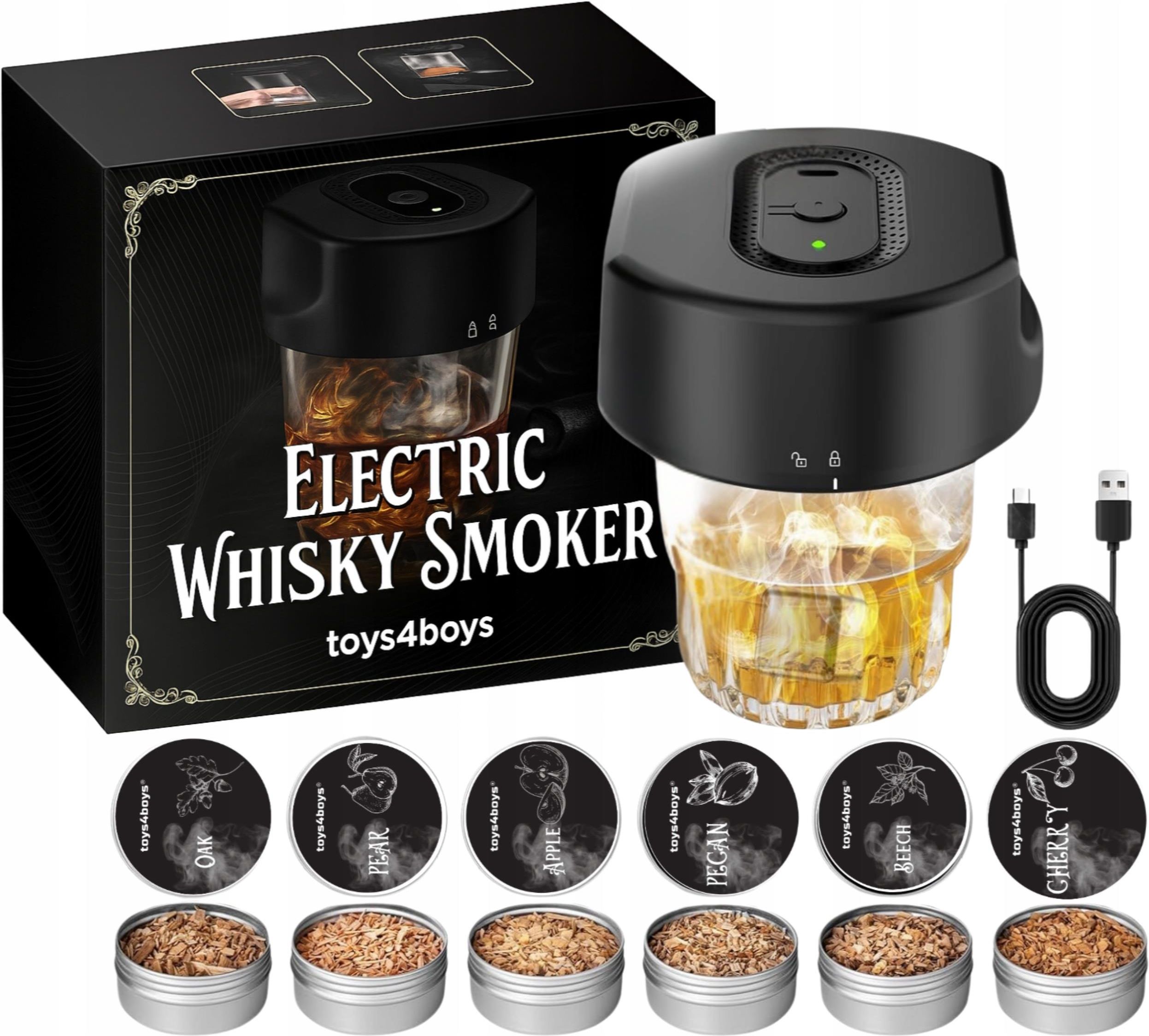 ZESTAW DO WĘDZENIA WHISKY SMOKER ELEKTRYCZNY DREWIENKA prezent dla taty Elektryczny Zestaw do wędzenia whisky USB Zestaw do wędzenia whisky z elektrycznym zapłonem bez butanu to nowoczesne, bezpieczne i ekologiczne rozwiązanie dla fanów dymnego aromatu. Zasilany przez USB, zapewnia 30 minut pracy po pełnym naładowaniu. Dzięki sześciu rodzajom wiórów drewnianych użytkownik może eksperymentować z różnymi smakami. To idealny prezent dla każdego mężczyzny – oryginalny, stylowy i prosty w obsłudze. Elektryczny zapłon – zero butanu, maksimum wygody Zamiast klasycznego zapalnika użyto bezpiecznego zapłonu elektrycznego. Urządzenie ładowane przez USB oferuje 30 minut pracy po pełnym naładowaniu. Każde uruchomienie trwa do 20 sekund, co sprawia, że zestaw jest bardziej wydajny, trwały i przyjazny środowisku niż tradycyjne wędzarki. Brak płomienia to także większe bezpieczeństwo użytkowania. 6 smaków dymu – pełna gama aromatów W zestawie znajdziesz 6 rodzajów naturalnych wiórów: dąb, jabłoń, orzech, wiśnia, grusza i buk. Dzięki nim stworzysz napoje o zróżnicowanym charakterze. Dobierając odpowiednią ilość wiórów, możesz regulować intensywność dymienia – od subtelnego aromatu po pełne, głębokie nuty dębu czy wiśni. Prosta obsługa, pasuje do większości szklanek Nakładka o średnicy 9 cm idealnie pasuje do typowych szklanek do whisky. Wystarczy wsypać wióry, umieścić urządzenie na szklance, przytrzymać przycisk przez 3 sekundy (migająca zielona dioda), a następnie nacisnąć ponownie, aby uruchomić zapłon. Cały proces trwa kilka chwil i jest niezwykle intuicyjny. Idealny prezent na wyjątkowe okazje Zestaw stanowi doskonały upominek na Dzień Ojca, urodziny, święta, rocznice czy parapetówkę. Eleganckie opakowanie i unikalny charakter sprawiają, że przypadnie do gustu każdemu mężczyźnie – tacie, mężowi czy przyjacielowi. To nie tylko gadżet – to sposób na wspólne chwile przy wyjątkowym drinku. DLACZEGO WARTO? Bezpieczny i ekologiczny zapłon Dzięki zasilaniu USB i elektrycznemu zapłonowi, zestaw eliminuje potrzebę używania butanu. To rozwiązanie nie tylko bardziej bezpieczne, ale też przyjazne środowisku i wygodne w codziennym użytkowaniu. Idealny prezent dla każdego faceta Zaskocz bliską osobę oryginalnym gadżetem! Zestaw doskonale sprawdzi się jako prezent na Dzień Ojca, urodziny, rocznicę, Boże Narodzenie czy parapetówkę – praktyczny i efektowny. Bogactwo aromatów W zestawie znajdziesz 6 rodzajów naturalnych wiórów: dąb, jabłoń, orzech, wiśnia, grusza i buk. Dzięki nim uzyskasz zróżnicowane nuty smakowe w zależności od okazji i nastroju. Prosty w obsłudze – dla każdego Nie musisz być barmanem! Obsługa jest banalnie prosta: wsyp wióry, przyciśnij przycisk, uruchom zapłon i ciesz się aromatem dymu w kilka sekund. Pasuje do większości szklanek. Specyfikacja Zawartość zestawu 1× Elektryczny generator dymu (USB ładowalny) 1× Pokrywka do szklanki (średnica: 9 cm) 6× Pojemniki z wiórami drzewnymi (dąb, jabłoń, orzech, wiśnia, grusza, buk) 1× Kabel USB do ładowania 1x Łyżeczka 1x Szczoteczko do czyszczenia 1× Instrukcja obsługi FAQ – najczęściej zadawane pytania Pytanie: Czy zestaw działa bez użycia butanu? Odpowiedź: ✅ Tak, urządzenie posiada elektryczny zapłon i jest zasilane akumulatorem ładowanym przez USB. Nie wymaga gazu, dzięki czemu jest bezpieczniejsze i bardziej ekologiczne od klasycznych rozwiązań. Pytanie: Czy urządzenie pasuje do wszystkich szklanek? Odpowiedź: ✅ Pokrywka ma średnicę 9 cm, co oznacza, że pasuje do większości standardowych szklanek do whisky, koktajli i niskich szklanek. Sprawdź wymiary swojego szkła, aby mieć pewność. Pytanie: Czy zestaw nadaje się także do innych alkoholi? Odpowiedź: Tak, możesz użyć aromatów w przypadku wina, koktajli, innych drinków czy nawet podczas gotowania.