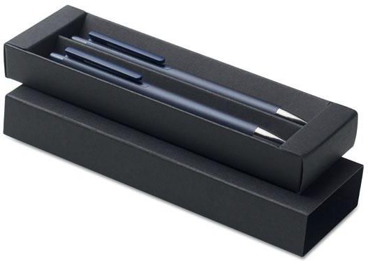 Zestaw długopisów z recyklingowanego aluminium z 1 długopisem i 1 grafitowym ołówkiem wiecznym. Niebieski tusz długopisu. Prezentowany w pudełku z papieru z recyklingu.