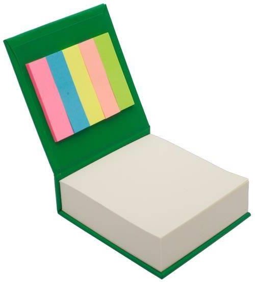 Blok zawierający 200 karteczek z papieru kremowego chamois o gramaturze 70 g/m2 oraz 5 x 25 karteczek memo o gramaturze 75 g/m2 w oprawie z laminowanego kolorowego papieru o gramaturze 128g/m2. Produkt wytworzony z dbałością o środowisko naturalne.