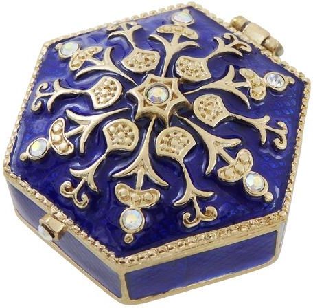 Bogato zdobione metalowe pudełeczko prezentowe z kryształkami - B0035-08BL Elegancka szkatułka B0035-08BL to idealny prezent dla kobiety. Bogato zdobiona kryształkami i utrzymana w granatowo-złotej kolorystyce. Wymiary: 5x5x2cm. Informacje o produkcie: • Wymiary: 5x5x2cm • Kolor: granatowo-złoty • Materiał: metal (cynk), szkliwo, kryształ • Piękne bogato zdobione granatowo-złote pudełko (otwierane) z kryształkami