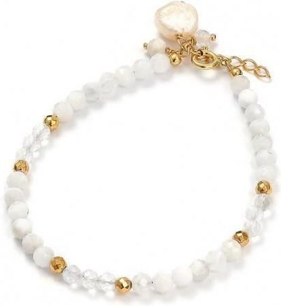 Bransoletka wykonana ze srebra próby 925 , pozłacanego 24 karatowym, żółtym złotem Kamień: Kamień księżycowy + Hematyt + Kryształ górski +perła Rozmiar kamienia: 4 mm/2mm Długość : 17,5 cm + przedłużka do 19,5 cm OPAKOWANIE W CENIE