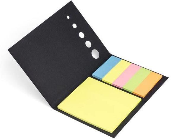 Karteczki samoprzylepne w pięciu kolorach oraz samoprzylepny notesik, umieszczone w czarnej okładce. Logo nadrukujemy na etui metodą tampodruku.