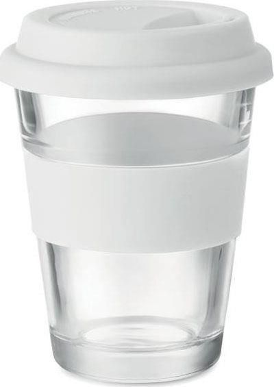 Szklany kubek z silikonową pokrywką i uchwytem. Pojemność 350 ml. Kubek posiada pojedynczą ściankę, więc może się nagrzewać.