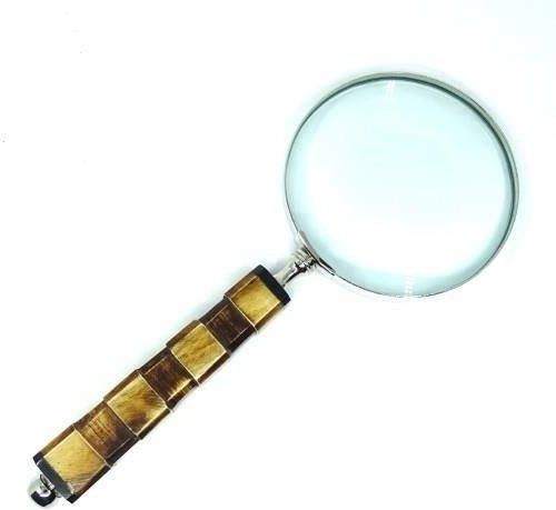 Szkło powiększające w oprawie mosiężnej, kościana rączka NC1099A Dł. 24,5cm, śr. 10cm, wys. 2cm Szkło powiększa 3,5 krotnie Rączka wykonana z kości - piękna brązowo - miodowa kolorystyka Oprawa szkła mosiężna - kolor srebrzysty Piękny prezent!