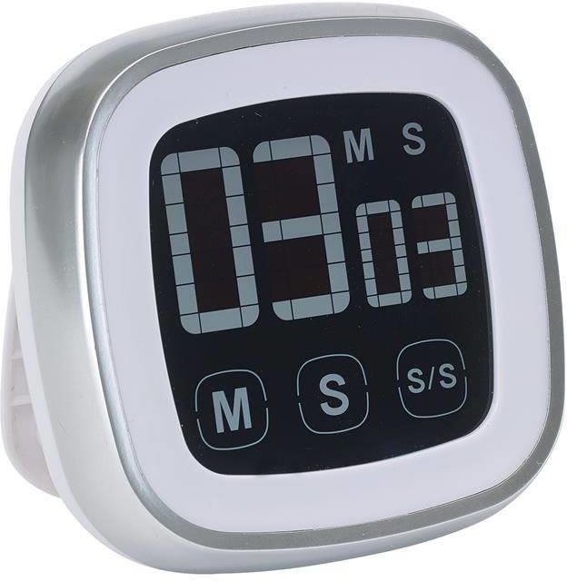 Minutnik TOUCH´N´COOK, biały, srebrny Kolory: biały, srebrny Stan: Nowy Waga: 0.07kg Minutnik TOUCH´N´COOK wyświetla do 99 min / 59 s, sygnalizacja dźwiękowa po upłynięciu czasu, prosta obsługa za pomocą przycisków dotykowych, z magnesem do mocowania oraz podpórką z tyłu artykułu.