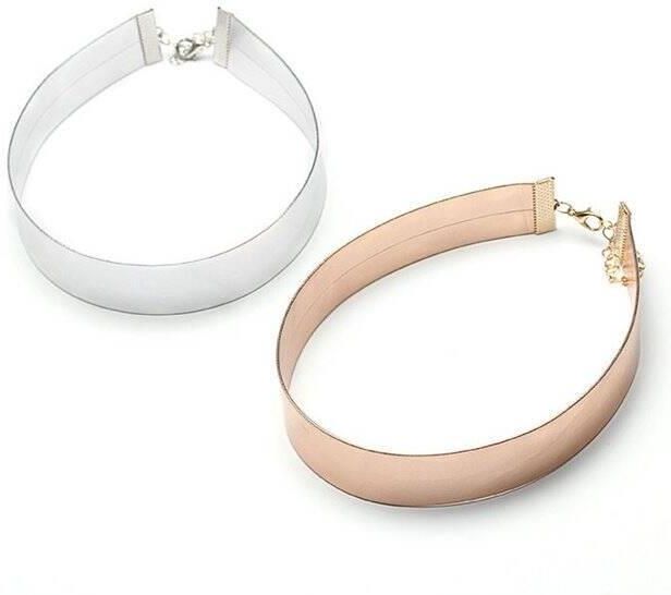 Metaliczny choker w kolorze różowego złota. HIT! Świetnie pasuje do eleganckich, jak również do codziennych stylizacji. Naszyjnik prezentuje się rewelacyjnie! Wykonany jest z rzemyka i stopów metali nieszlachetnych. Nie są odporne na wodę. WYMIARY: długość: 30cm + regulacja szerokość: 2 cm