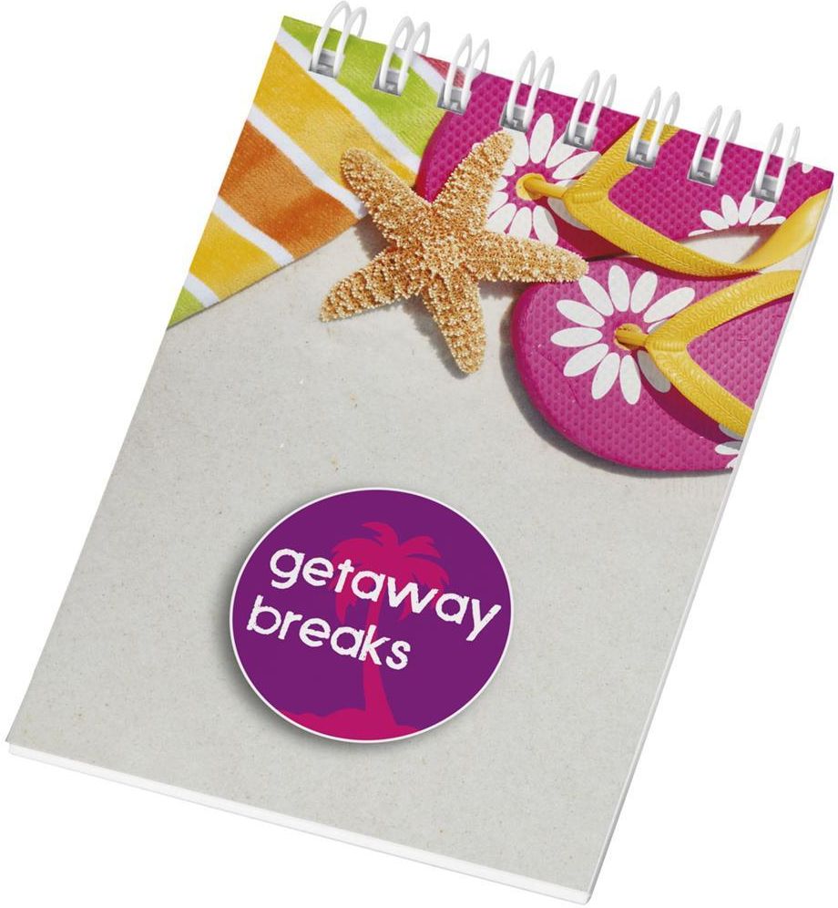 Notes na spirali Desk-Mate® w formacie A7. Notatnik ten posiada białą lub czarną przedziałkę, obity jest w lakierowaną, twardą okładkę (250g/m2) i zawiera 50 arkuszy (80g/m2) czystych kartek. Możliwość zdobienia okładki i każdego arkusza.