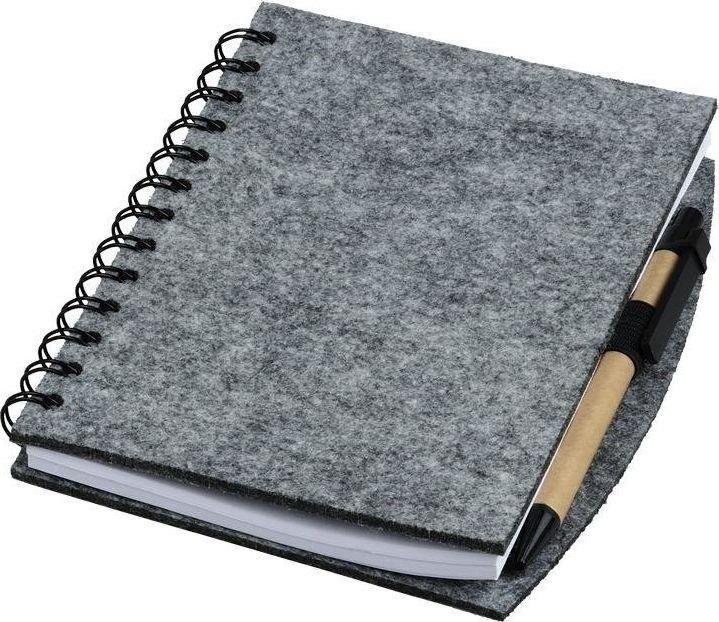 Notes z filcu Eco-Sense w kolorze szarym. Oprawiony w filc 80-kartkowy notatnik o gramaturze 70 g/m². Wyposażony w długopis wykonany z kartonu z recyklingu. Wielkość 15 x 18 x 1,4 cm Ekologiczny gadżet zawsze pod ręką. Notes sprzedawany w kompletach po 2 szt.