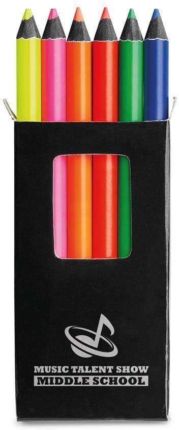 Pudełko z 6 małymi, fluorescencyjnymi, drewnianymi kredkami.90 x 10 x 48 mm