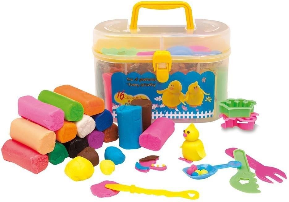Plastelina Funny Activity , zawiera 16 różnych kolorów plasteliny, 2 foremki do formowania i 4 narzędzia (kolory i formy mogą różnić się w zależności od foremek i narzędzi) pakowana w pudełko z uchwytem do przenoszenia.
