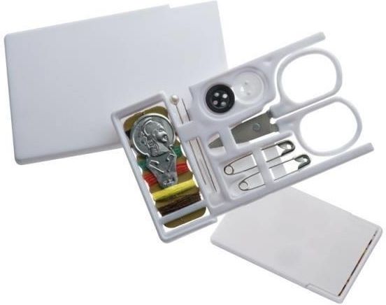 Podróżny zestaw do szycia. Nożyczki, igły, nici, agrafki, nawlekarka do nici i zapasowe guziki - wszystko czego potrzebujesz, aby uniknąć konfekcyjnych „niespodzianek”. Zestaw w praktycznym pudełku w kształcie karty kredytowej. Logotyp umieszczamy na wieczku pudełka.